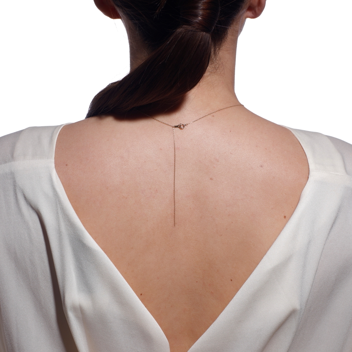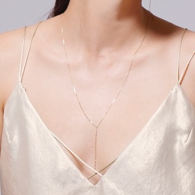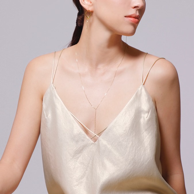 2つの異なる繊細な美しいカットのチェーンが、身体のシルエットに沿って流れるような曲線を描くロングネックレス。知的でフェミニンな華やかさを演出してくれます。