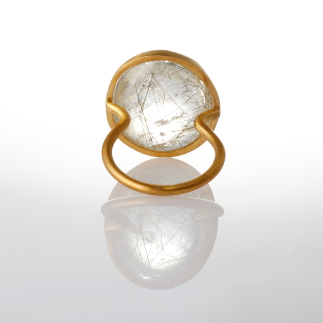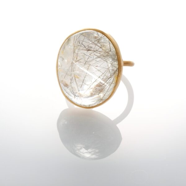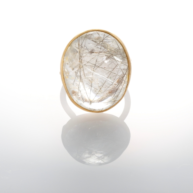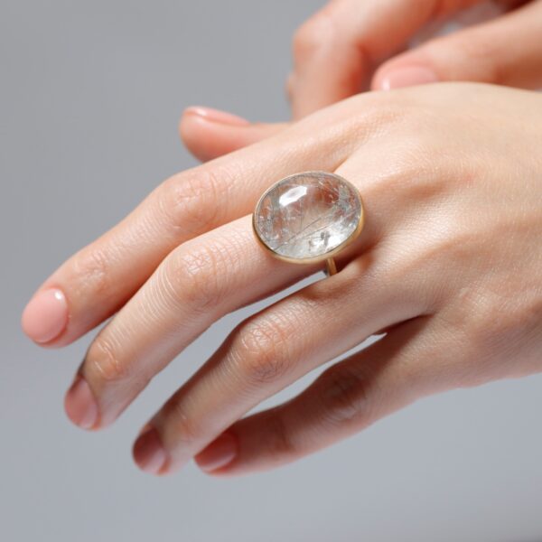 天然シルバールチルクォーツに、漂い輝くインクルージョン。見る環境によって表情は様々。肌馴染みの良いクリアなカボションリングは、デニムにもドレスにも、シーンを選ばず寄り添います。